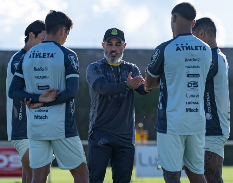 O técnico Rafael Guanaes conversa com jogadores em treino do Mirassol - Crédito: JP Pinheiro/Agência Mirassol