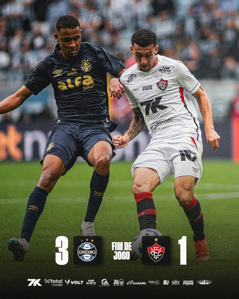 O Grêmio venceu o Vitória por 3 a 1, neste domingo (28), na Arena Grêmio, em Porto Alegre, pela 25ª rodada do Campeonato Brasileiro.