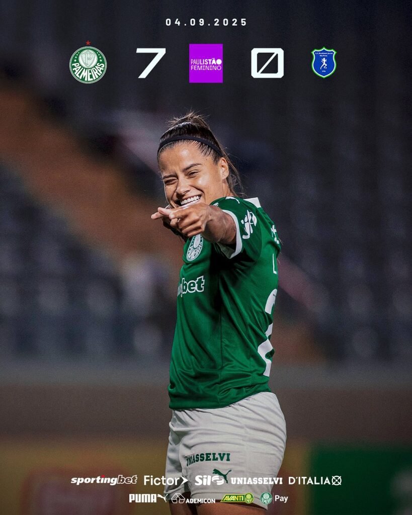 O Palmeiras goleou o Realidade Jovem por 7 a 0, nesta quinta-feira (4), na Arena Barueri, pela oitava rodada do Campeonato Paulista feminino.