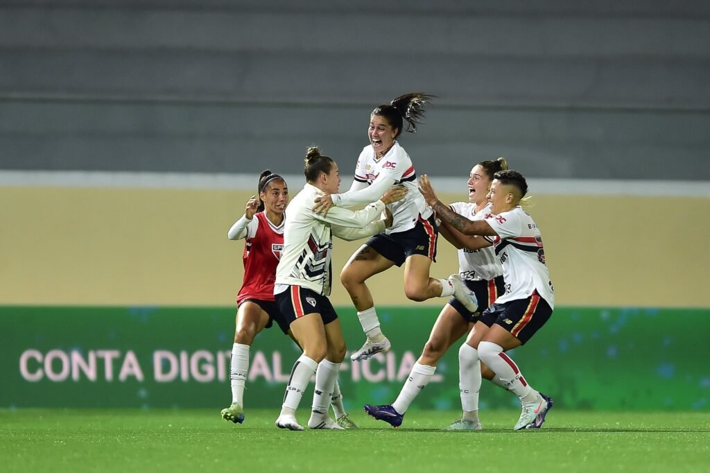 Jogadoras do São Paulo comemoram o gol da vitória – Crédito: Sataff/CBF O São Paulo venceu o Palmeiras por 2 a 1, neste sábado (3), na Arena Barueri, pela nona rodada do Brasileiro feminino. O resultado deixa o Tricolor em quarto lugar, com 17 pontos, empatado com o Palmeiras, que segue na frente pelo saldo […]