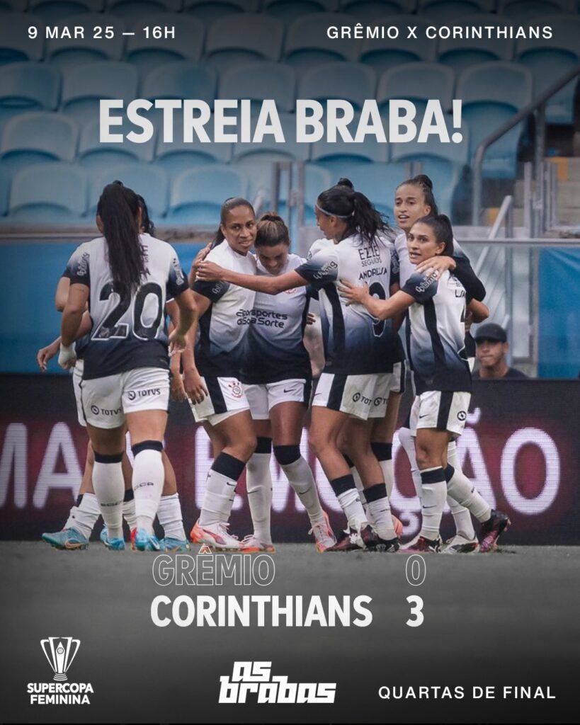 O Corinthians venceu o Grêmio por 3 a 0, neste domingo (9), na Arena Grêmio, em Porto Alegre, e garantiu vaga na semifinal da Supercopa feminina. O adversário do Timão será o Cruzeiro, que despachou o Bahia no sábado (8), por 1 a 0. Pelo saldo de gols, a semifinal será com mando do Corinthians, […]