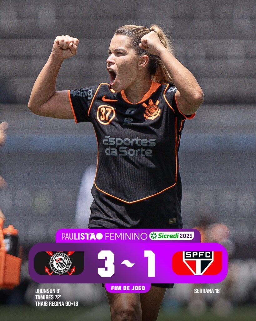 O Corinthians venceu o São Paulo por 3 a 1, neste sábado (1), no Parque São Jorge, pela 11ª rodada do Campeonato Paulista feminino.