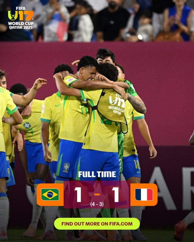 O Brasil venceu a França por 4 a 3, nos pênaltis, após empate em 1 a 1 no tempo normal, nesta terça-feira (18), em Doha, no Qatar, e garantiu vaga nas quartas de final da Copa do Mundo sub-17.