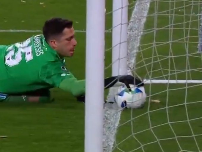 Goleiro do Racing quase leva um frango e tira a bola em cima da linha.