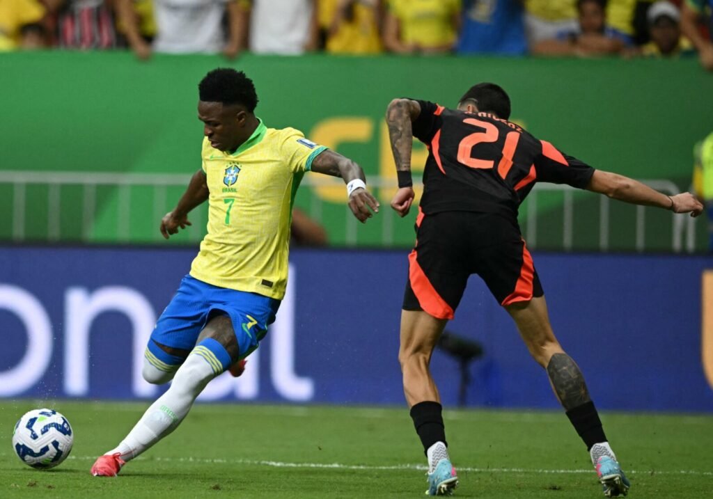 Vinícius Jr. domina a bola para finalizar – Crédito: @conmebol O Brasil venceu a Colômbia por 2 a 1, nesta quinta-feira (20), no estádio Mané Garrincha, em Brasília, pela 13ª rodada das eliminatórias para Copa do Mundo de 2026. O resultado leva a seleção brasileira ao segundo lugar na classificação, com 21 pontos, quatro atrás […]
