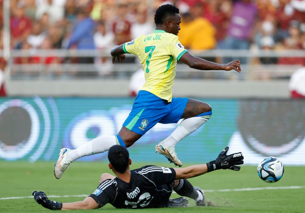 Vinícius Júnior tenta passar pelo goleiro Romo – Crédito: Rafael Ribeiro/CBF Brasil e Venezuela empataram em 1 a 1, nesta quinta-feira (14), no estádio Monumental de Maturín, pela 11ª rodada das eliminatórias para a Copa de 2026. O resultado leva o Brasil ao terceiro lugar, com 17 pontos, um a mais que o Uruguai, que […]