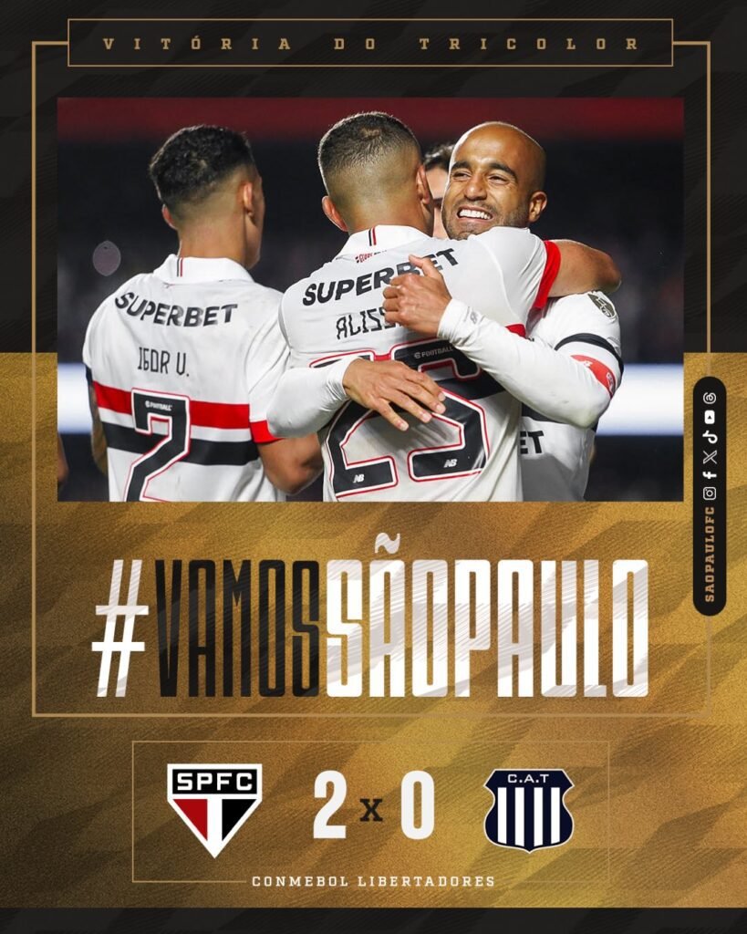 Disputa de bola entre São Paulo e Talleres, no MorumBis – Crédito: @libertadores O São Paulo venceu o Talleres-ARG por 2 a 0, nesta quarta-feira (29), no MorumBis, pela última rodada da fase de grupos da Libertadores, e garantiu a primeira colocação de sua chave. Coma vitória, o Tricolor chegou aos 13 pontos, empatado com […]