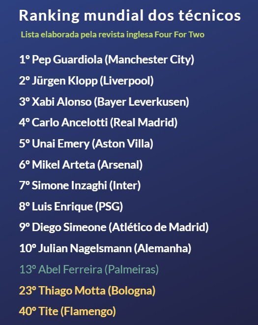 A revista inglesa Four For Two divulgou nesta semana a sua tradicional lista com os 50 melhores técnicos do mundo. O português Abel Ferreira, do Palmeiras, aparece na 13ª colocação.