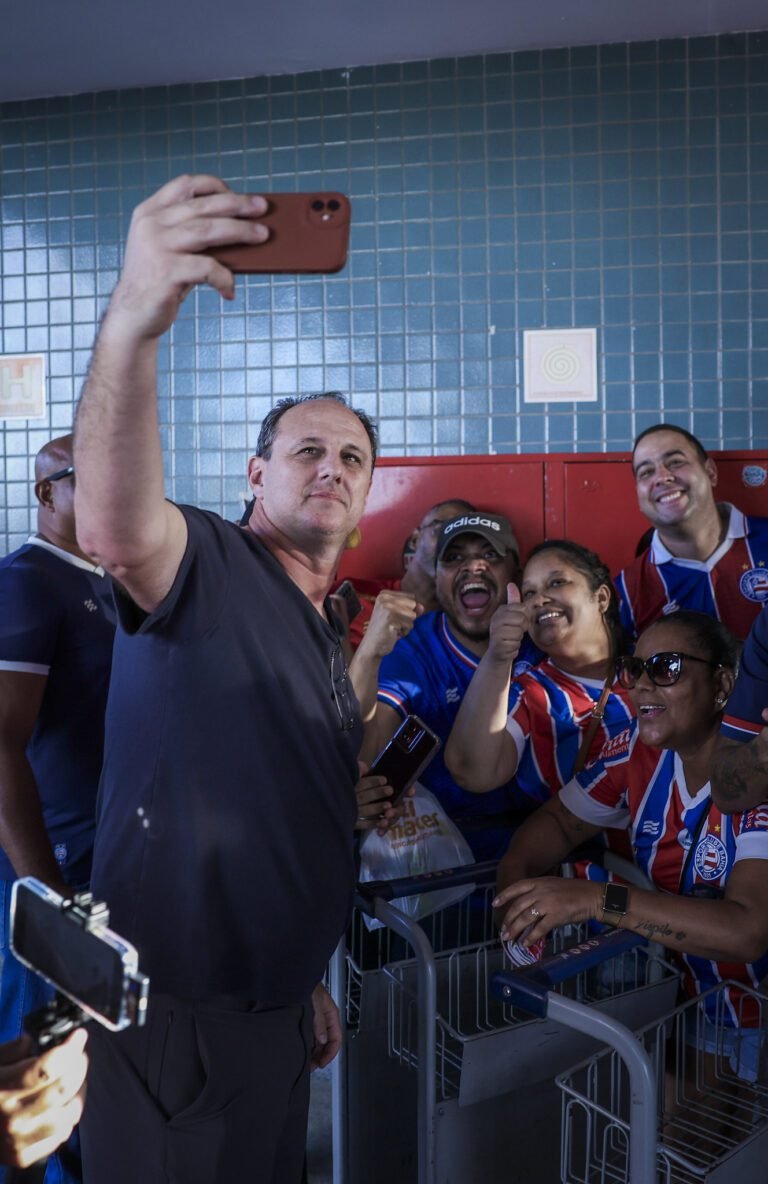 O técnico Rogério Ceni interage com os torcedores no embarque do Bahia - Crédito: Divulgação/EC Bahia