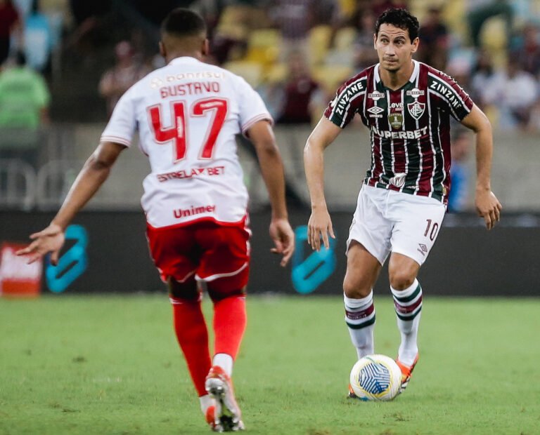 Ganso e Gustavo, em lance do jogo entre Fluminense e Inter, no Maracanã - Crédito: Lucas Merçon/Fluminense
