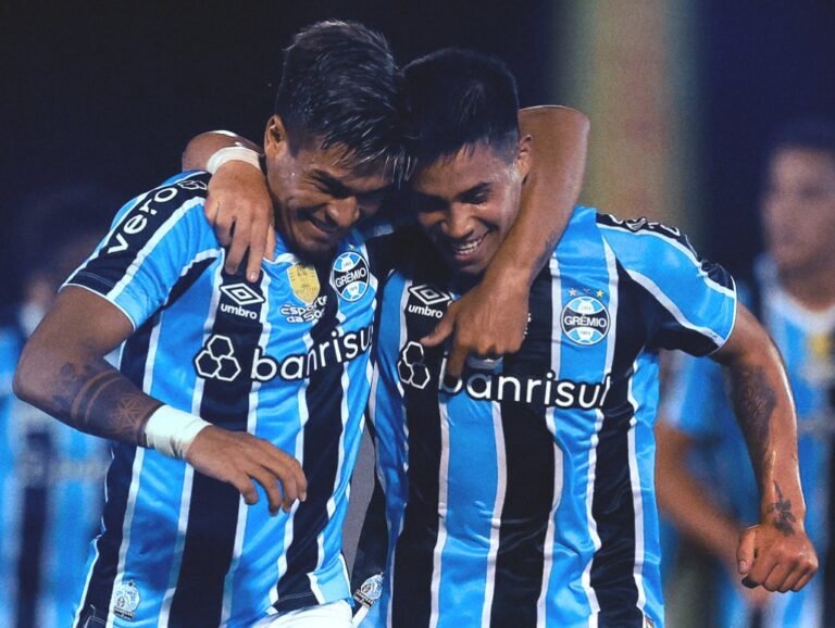 Arezo (dir.) é abraçado na comemoração do gol do Grêmio - Crédito: @gremio/X