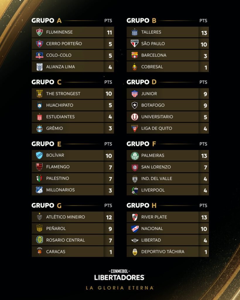 Fluminense, Palmeiras, Atlético-MG, Talleres e River Plate ainda disputam quem terá a melhor campanha no geral, o que dá vantagem de decidir em casa nos jogos das próxima fases.