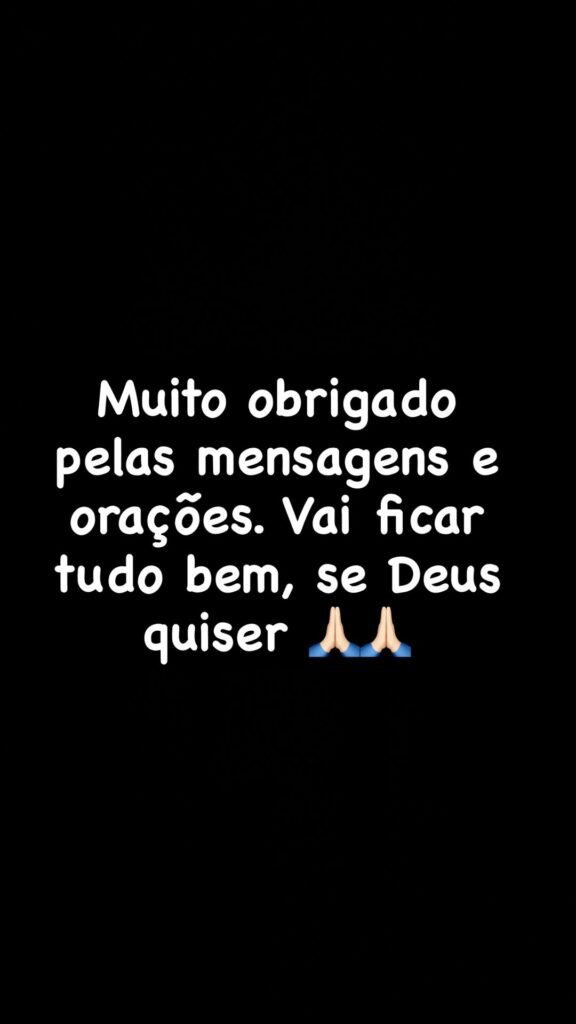 O jogador de 34 anos se manifestou por meio das redes sociais na manhã desta quarta (12). “Muito obrigado pelas mensagens e orações. Vai ficar tudo bem, se Deus quiser”, escreveu.
