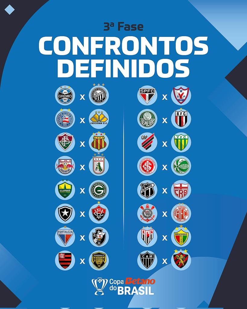 A CBF sorteou na tarde desta quarta-feira (17) os duelos da terceira fase da Copa do Brasil. Dos 16 jogos, quatro serão entre equipes da Série A do Brasileiro.