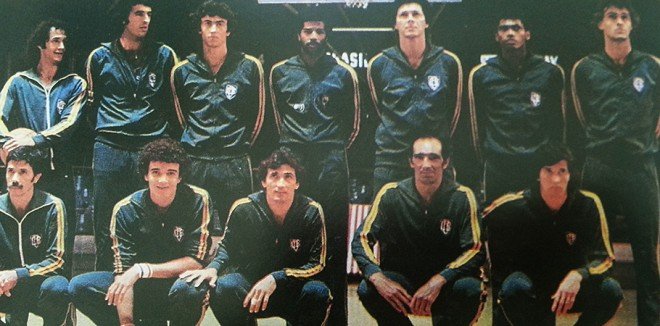 Brasil, medalha de bronze nas Filipinas-1978. Da esq. para a dir.: Carioquinha, Marquinhos, Marcelo Vido, Adilson, Robertão, Gilson, Oscar. Agachados: Hélio Rubens, Marcel, Fausto, Ubiratan e Agra