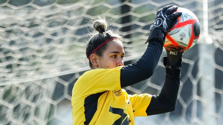 A goleira Stefane. em treino do Santos - Crédito: @SereiasdaVila/X