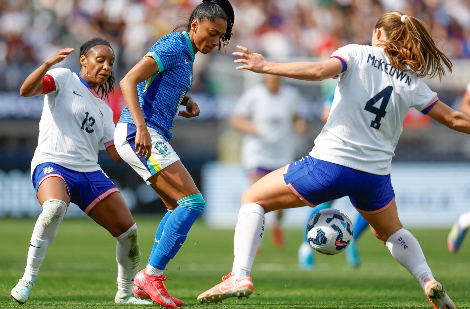 Kerolin domina a bola, marcada por duas adversárias - Crédito: Rafael Ribeiro/CBF
