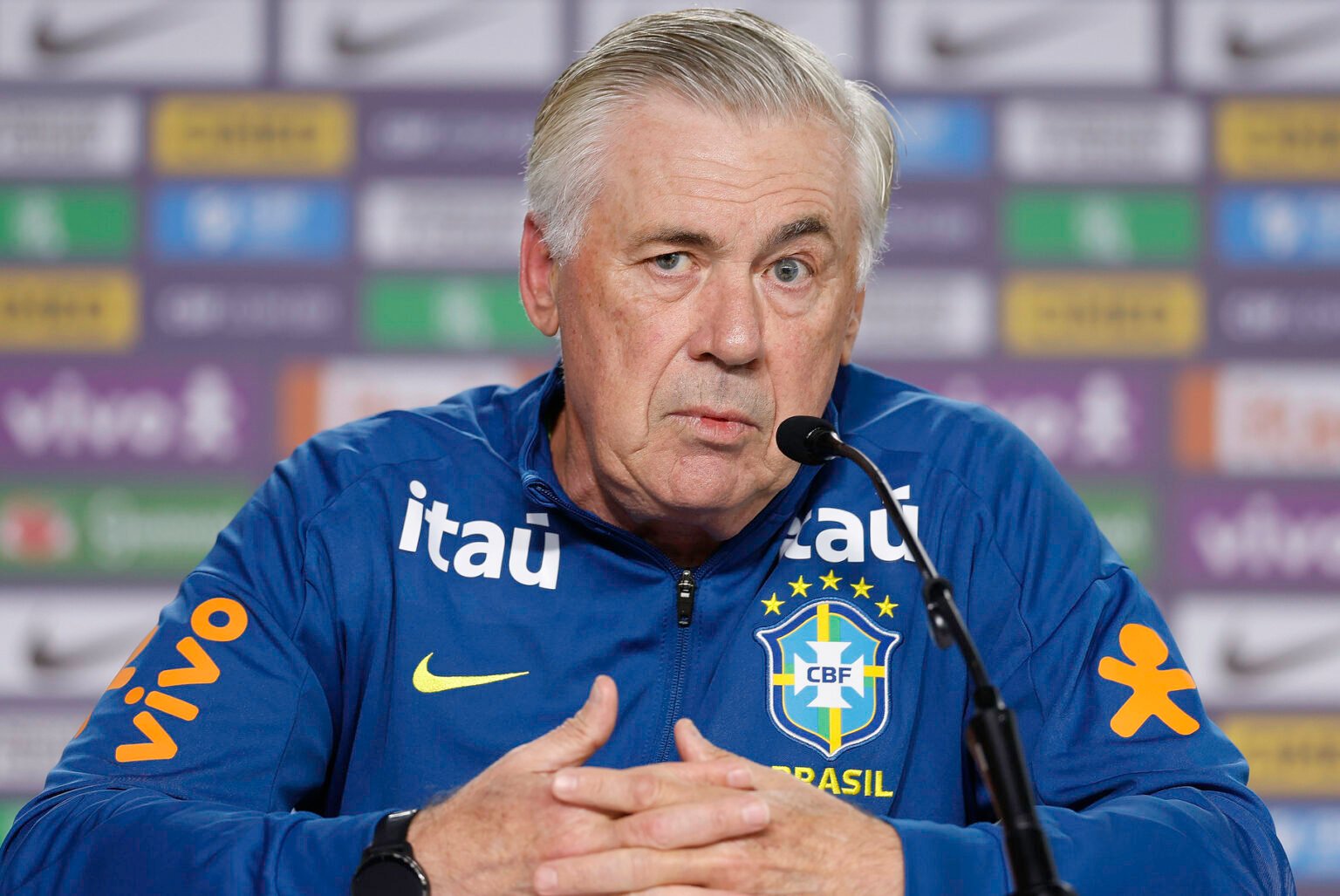 O técnico Carlo Ancelotti, durante a entrevista coletiva - Crédito: Rafael Ribeiro/CBF