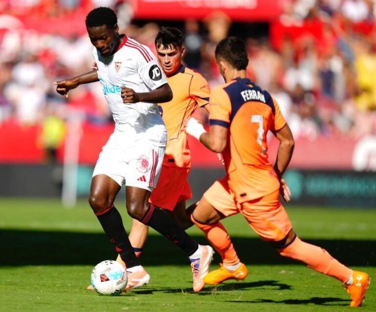 Disputa de bola entre Sevilla e Barcelona - Crédito: @sevillaFC/X