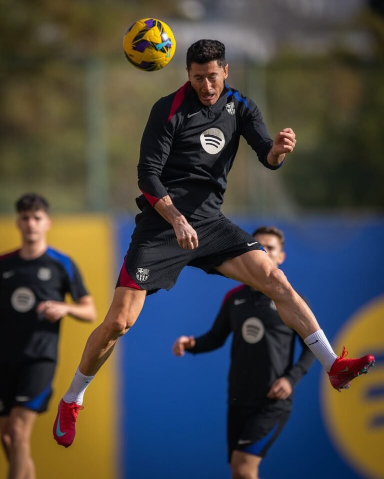 O atacante Lewandowski, em treino do Barcelona - Crédito: @fcbarcelona