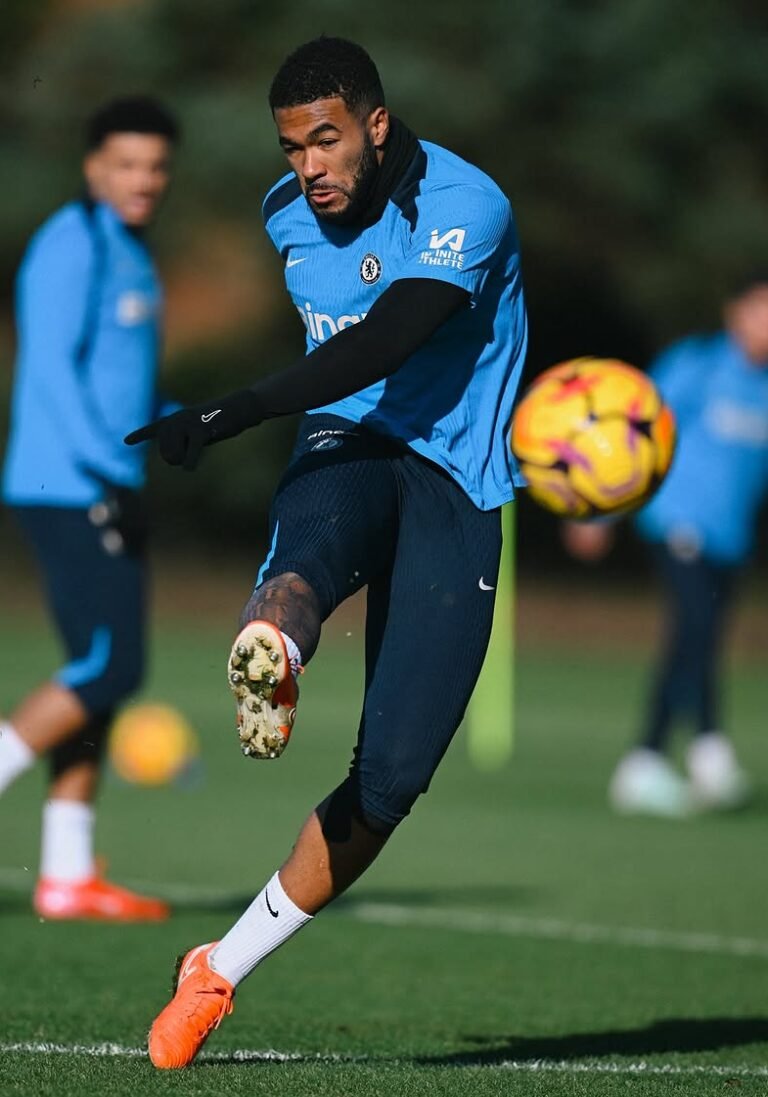 Reece James, em treino do Chelsea - Crédito: @chelseafc