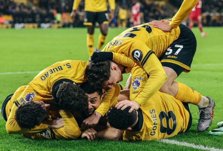 André é abraçado na comemoração do gol da vitória - Crédito: @wolves