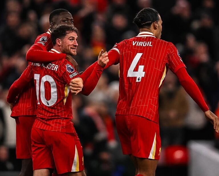 Mac Allister é abraçado na comemoração do gol do Liverpool - Crédito: @liverpoolfc