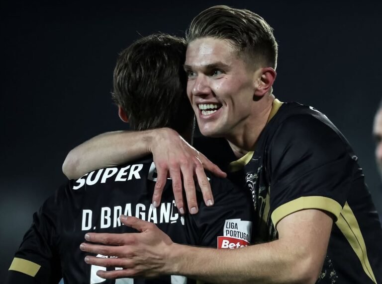 Gyokeres abraça Daniel Bragança na comemoração do gol - Crédito: @sportingcp
