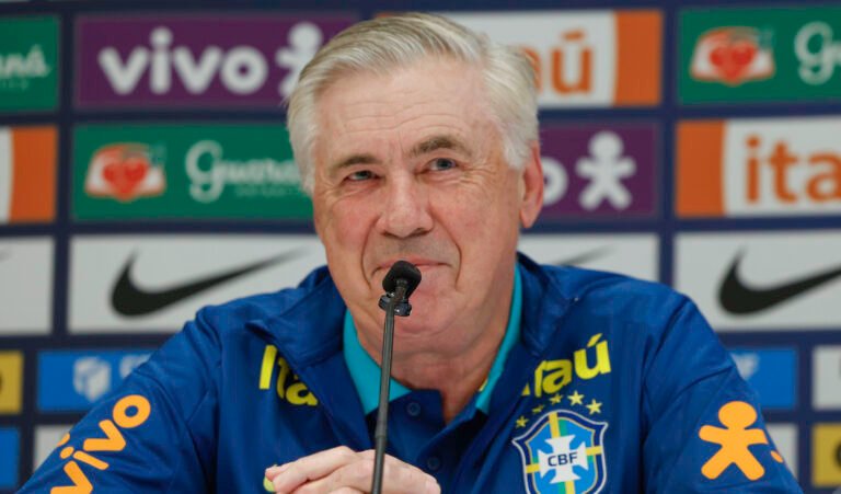 O técnico Carlo Ancelotti participou da entrevista coletiva nesta quarta-feira (4), em Guayaquil, véspera do jogo contra o Equador, pelas eliminatórias da Copa do Mundo.