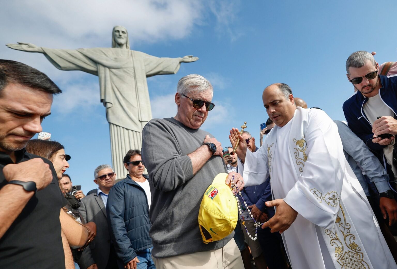 Ancelotti recebe bênção do padre Omar, em frente ao Cristo Redentor - Crédito: Rafael Ribeiro/CBF